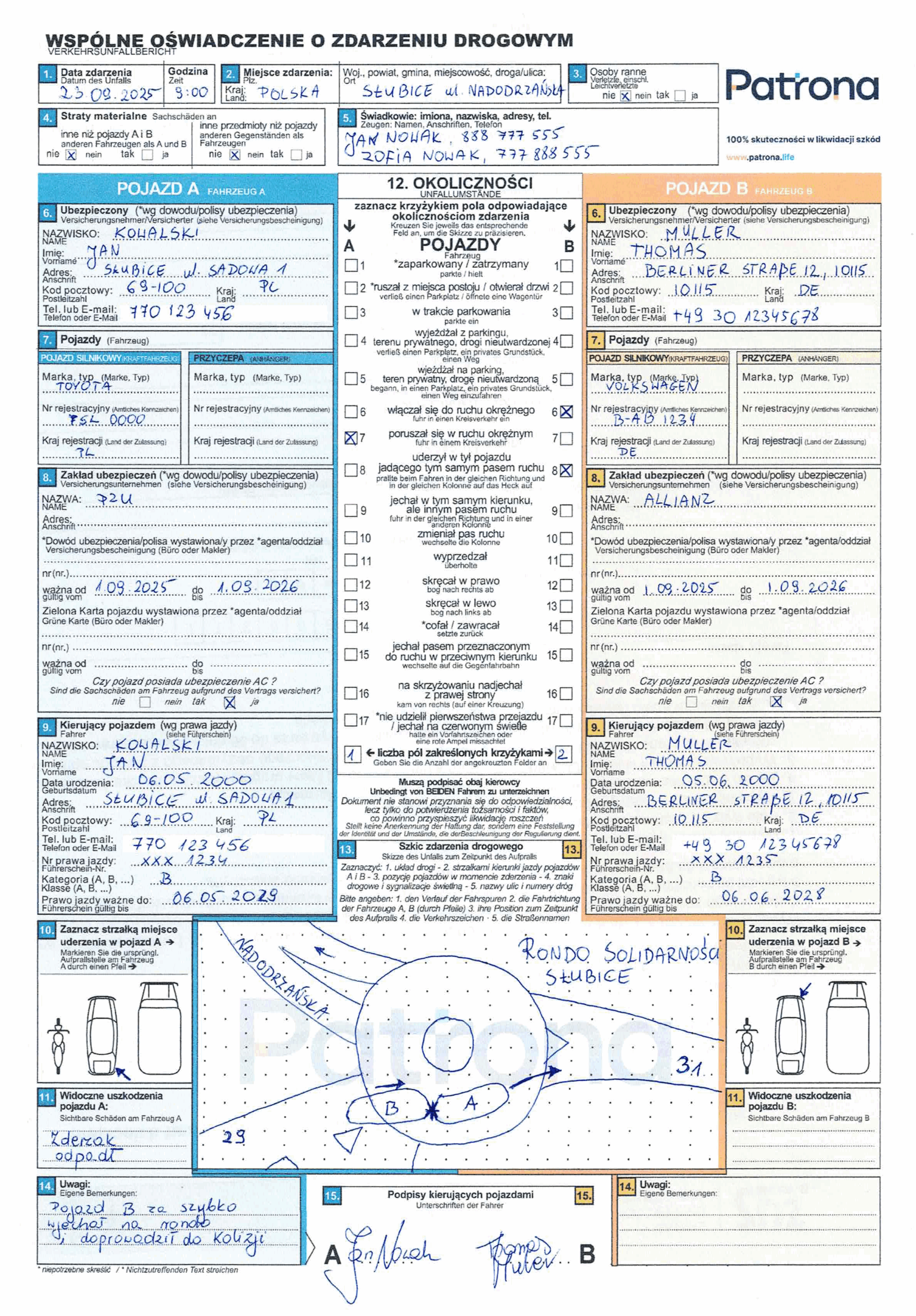 Jeśli miałeś kolizję z kierowcą z Niemiec lub innego kraju, nie musisz być w tym sam – Patrona pomaga kierowcom z całej Polski w likwidacji szkód i walce o pełne odszkodowanie.