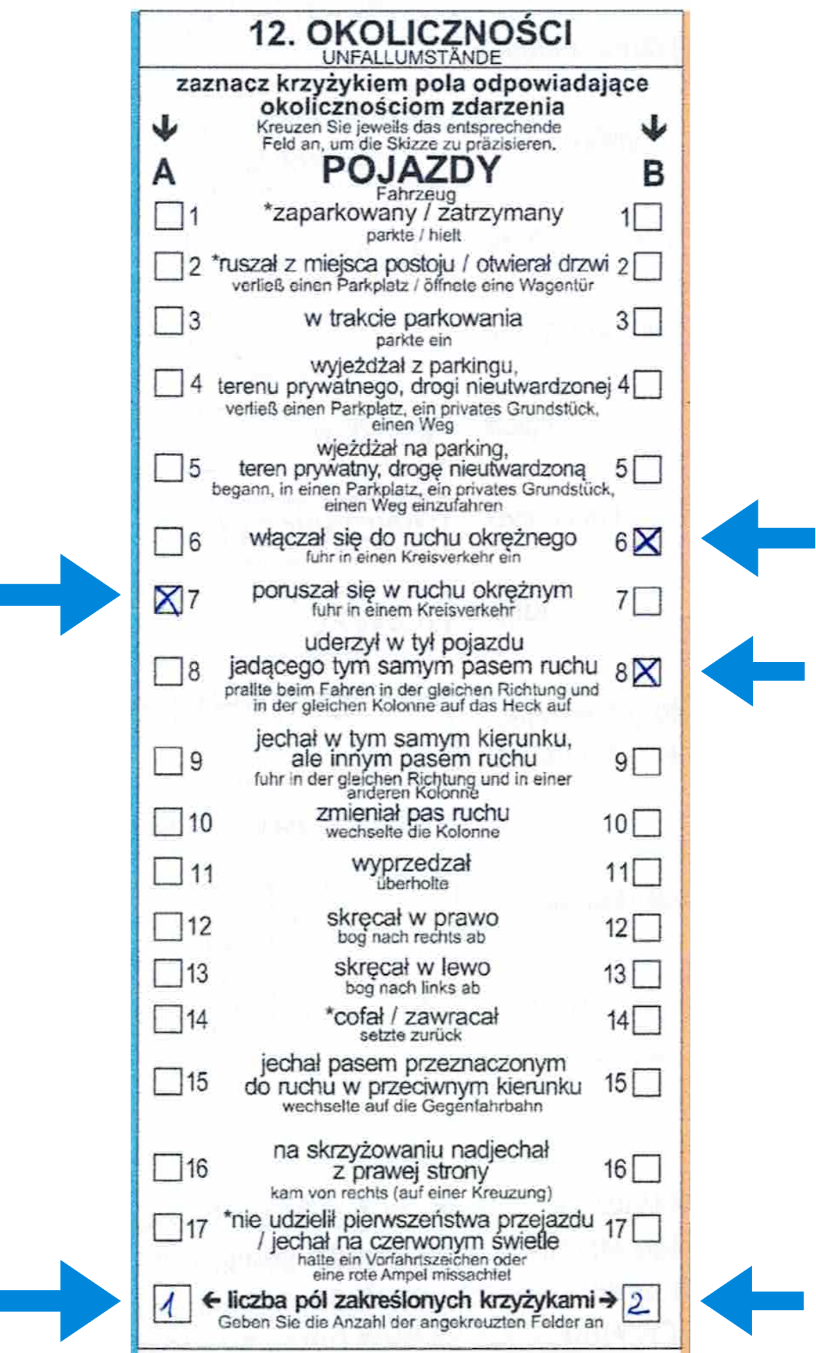 TIP: Jeśli korzystasz z naszego wzoru oświadczenia sprawcy wypadku, to pamiętaj, aby poza wypisaniem danych sprawcy i poszkodowanego, zaznczyć również znak „X” w środkowej części dokuemntu tzn. okoliczności kolizji. Jest tak wiele profesjonalnie określonych podpowiedzi, które pomogą Ci w jasny sposób określić zdarzenie.