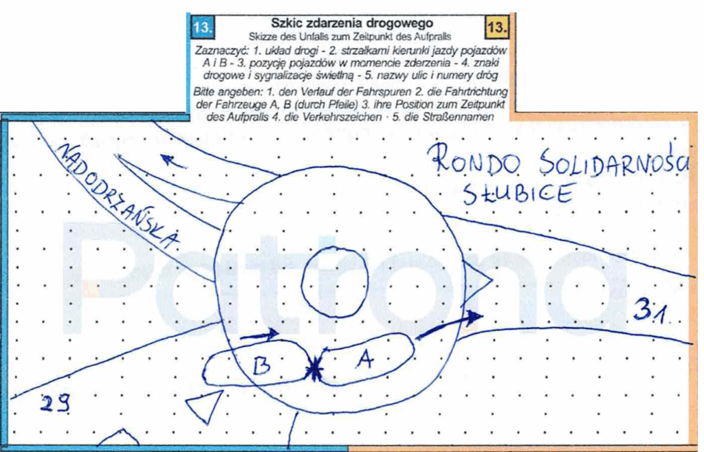Dołącz szkic sytuacyjny: narysuj miejsce zdarzenia, ustawienie pojazdów i kierunki ich ruchu.